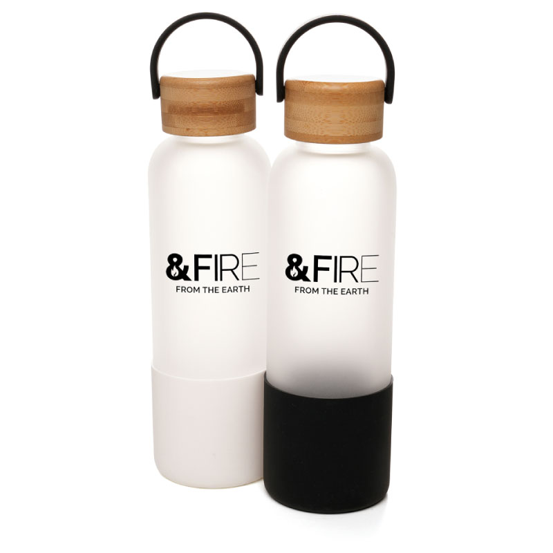 This elegant glass bottle combines style and functionality with a bamboo lid and convenient carry handle for easy portability.