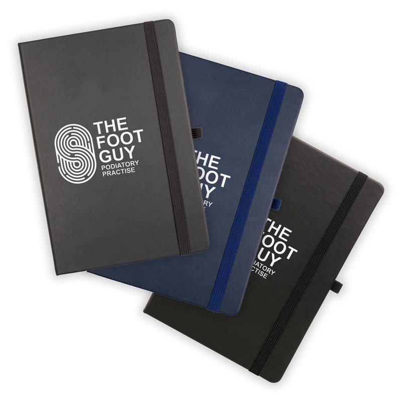 This notebook comes with a Recycled PU outer cover and durable 950gsm recycled cardboard inner cover. Inside, you'll find 80 perforated sheets of 100gsm cream recycled paper with gun metal edging for a premium look. The notebook is equipped with back pocket, polyester double bookmark ribbons, elastic band closure and a pen loop with gun metal stud. 10p from every notebook sold is donated to ‘Helping Uganda Schools Charity’. Product can be printed 4 spot colour only, debossed/foil blocked or direct digital.
