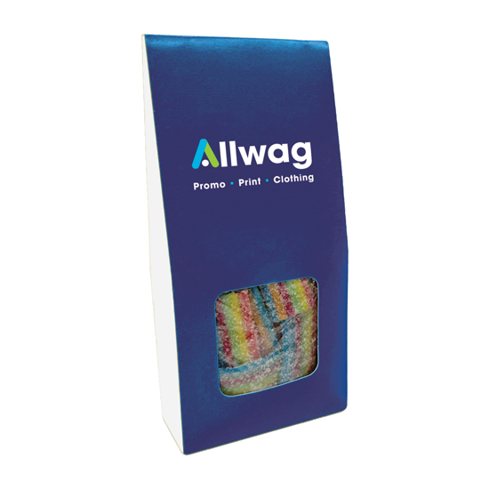 Showcase your brand in style with our sustainable Satchel Boxes, featuring full colour, all over bespoke print, for maximum impact. Designed to stand upright with a clear front window, each box reveals a compostable bag filled with your choice of delicious treats.