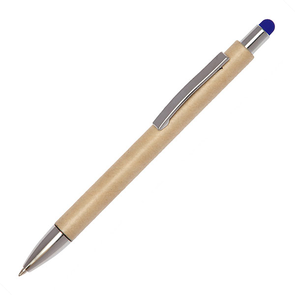 Cardboard stylus ballpen. Push action. Recycled cardboard barrel. Metal nib, clip and button. Coloured stylus on button.