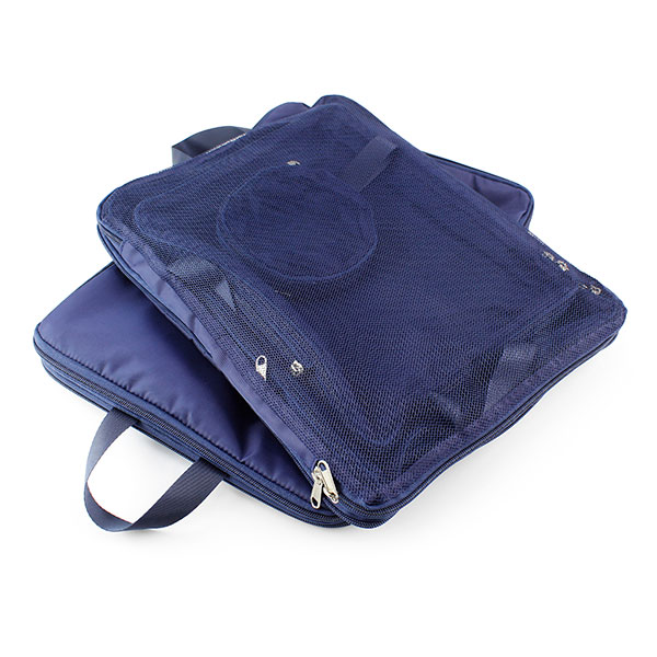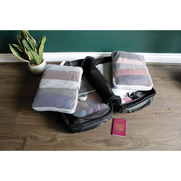 Compression Packing Cube with double zip, one to close the cube and one to compress the contents for ease of packing. Once the zip is closed it compresses the volume of your packing by roughly a third. The outer cube neatly contains the other five. The outer cube is solid and can be branded to either side.